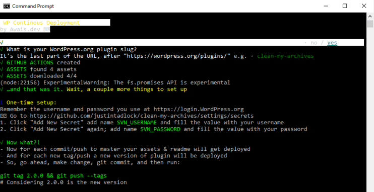 , the script is installed. It then prompts you to enter your WordPress.org plugin slug to set everything up. Once done, you merely need to create a couple of secret keys on your GitHub repository.