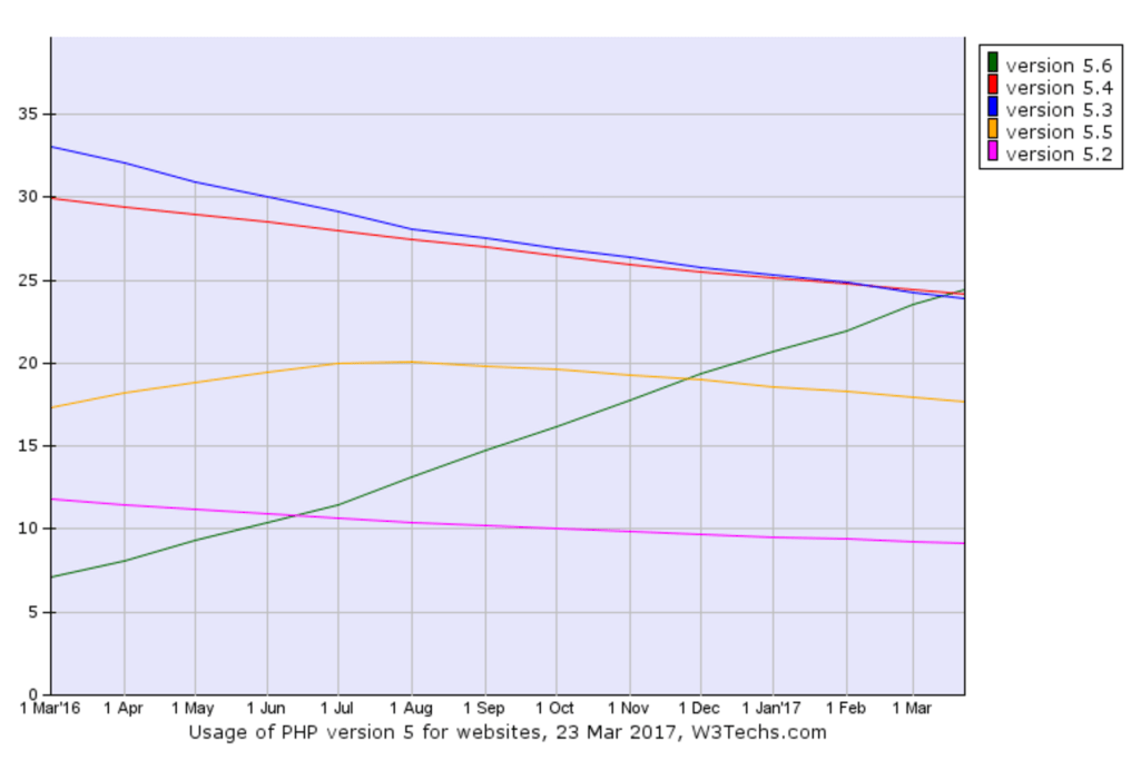 PHP 5.6 overtaking older versions is a significant milestone for the PHP community, since it still receives support for critical security issues until December 31, 2018. The older versions that previously dominated usage reached End of Life in 2015 and 2016 and are no longer receiving security updates.